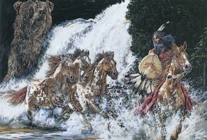 In Spirits of Grizzly Creek, a Native American must cross a swift stream. Many tribes were terrified of underwater spirits. The Native American portrayed has called upon the potent strength of the bear to permit a safe passage. Four grizzly spirits reveal themselves and accompany him as he races through the creek. He will achieve safe passage because his medicine is strong. Actual image size is 19" x 25" with a retail price of $235. (Click image to see larger picture.)